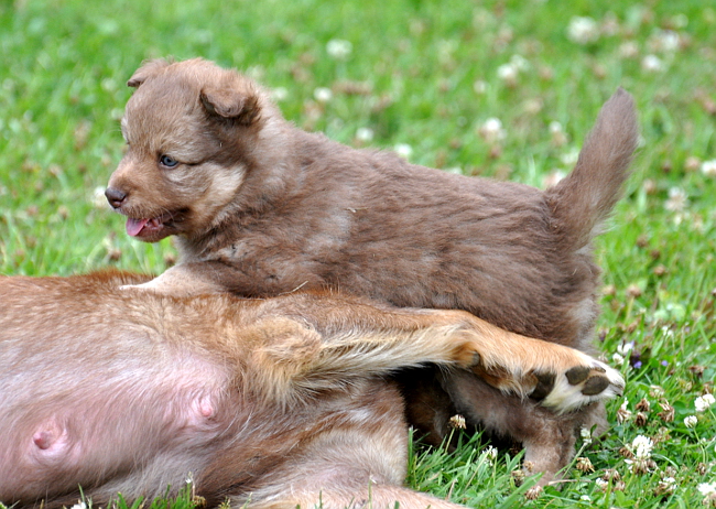 Pupelot on jo reilu viisiviikkoisia, ja voi sitä menoa!! Hobitit on tosi paljon ulkona, ja meno on aikamoista. Ruskalle on varsin ok nyt, että koko mun oma lauma hengaa pupsien ja Ruskan kanssa. Se tuntuu välillä olevan varsin tyytyväinen, kun mun lauman otukset leikittää ja viihdyttää pupseja, ja mammakoira itse voi hengailla pitkin pihaa ja keksiä muita juttuja. :) Omat koirani suhtautuu niin fiksusti pentuihin, että kaikki voivat huoletta ulkoilla ja hillua pihalla, ihan koko porukka. :)
